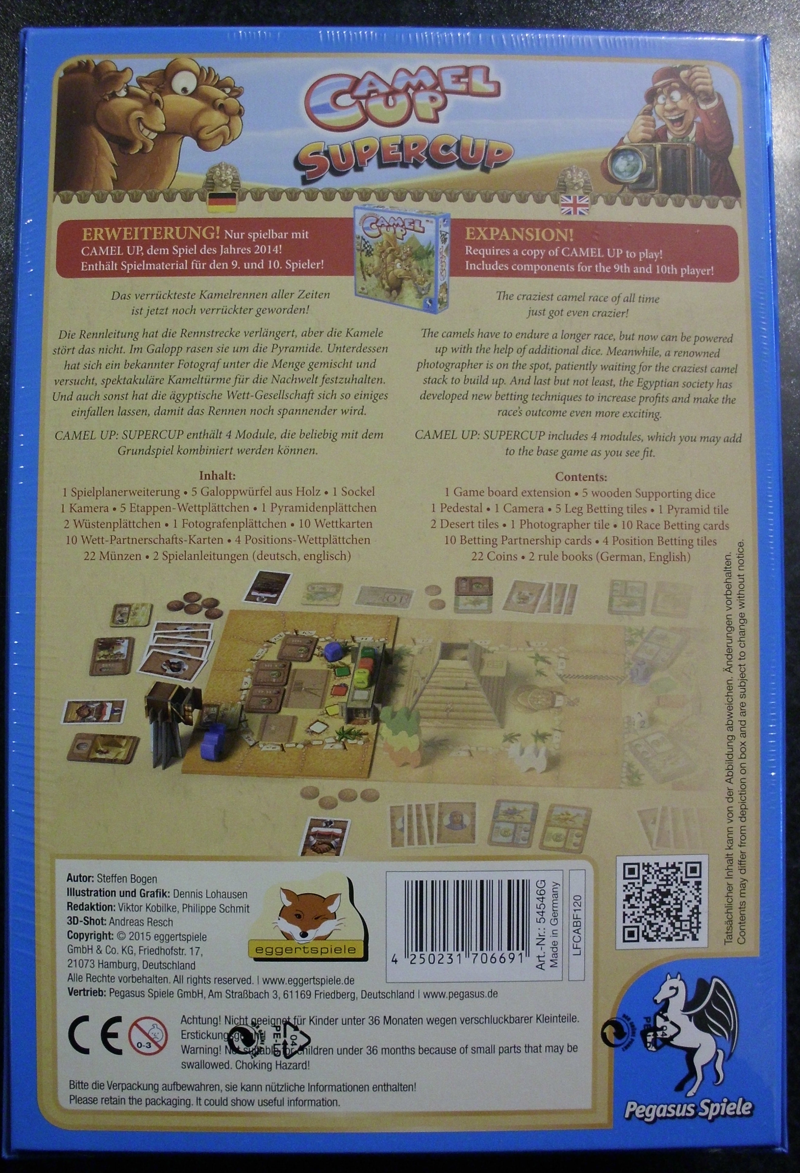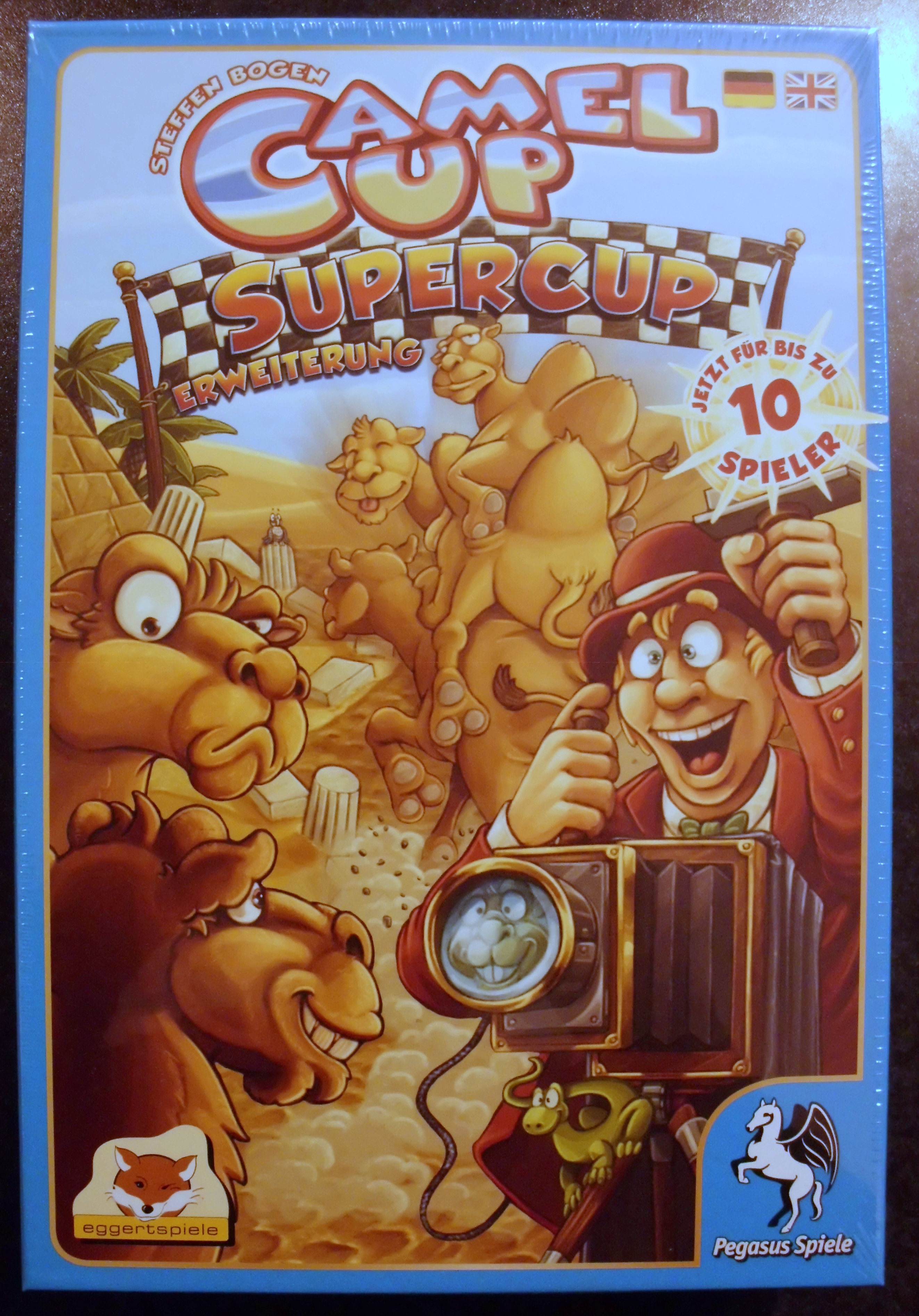 Hier ist gerade ein Kamel in den Laden galopiert und hat uns die Erweiterung zum Spiel des Jahres 2014 Camel Up „Supercup“ vorbeigebracht. Vier spannende Module für das beliebte Spiel mit den gestapelten Kamelen. Die Rennstrecke wird verlängert, ein gewitzter Fotograf hofft auf das beste Foto eines Kamelturms und auch sonst hat sich die Wett-Gesellschaft allerhand einfallen lassen um das Rennen noch spannender zu machen.