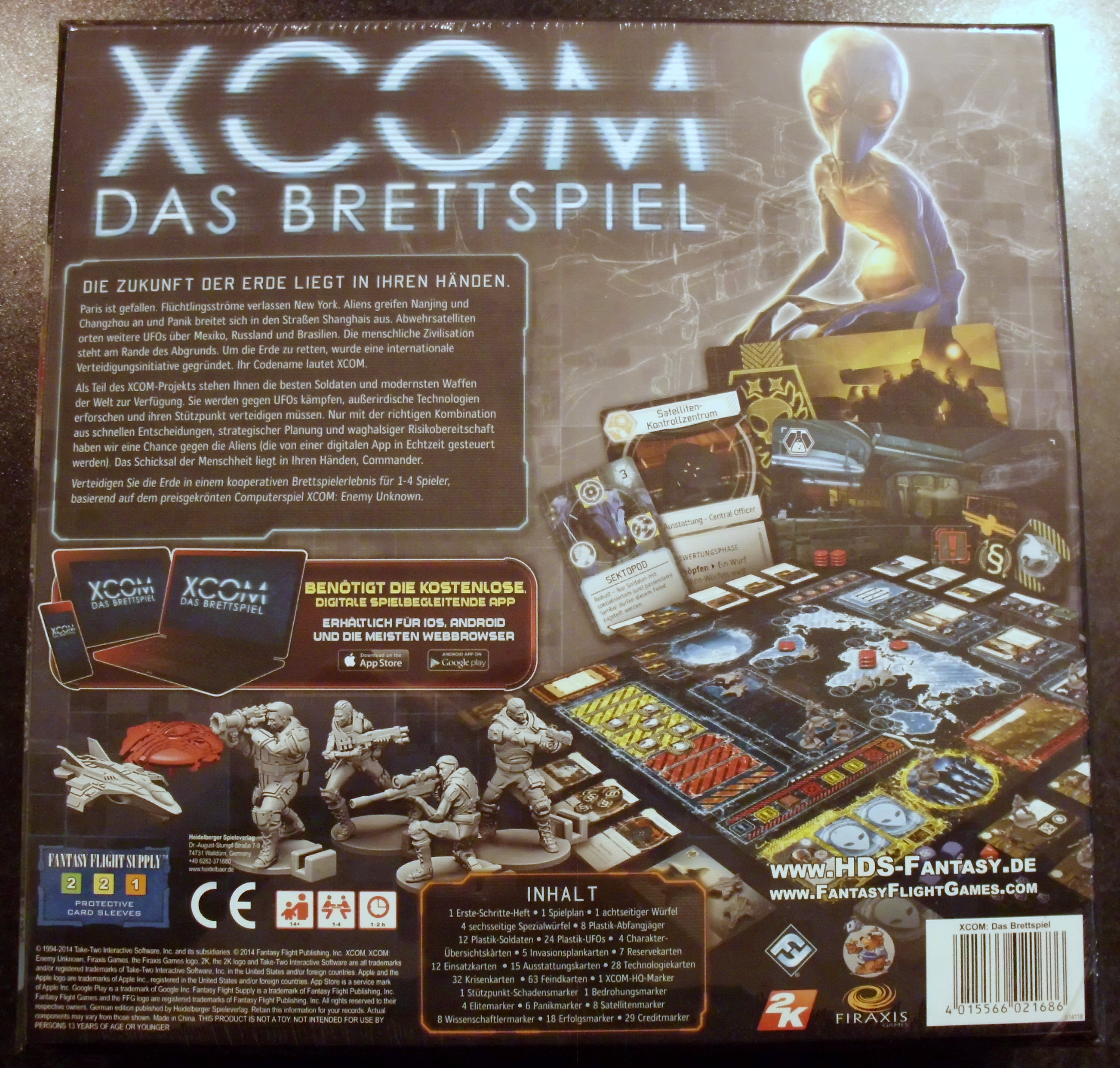 Gerade ist hier kurz ein UFO aus Heidelberg gelandet und hat uns die deutsche Version des kooperativen Spiels „XCom“ vorbeigebracht. Bei diesem, durch eine App (Android/IOS) unterstütztem, Brettspiel versuchen wir gemeinsam die Erde vor fiesen Aliens zu schützen. Das Spiel basiert auf dem sehr erfolgreichen PC und Konsolenspiel XCom und bringt das Feeling des Computerspiels sehr gut rüber. Also kommt vorbei und holt euch XCom das Brettspiel, die Menschheit zählt auf euch!