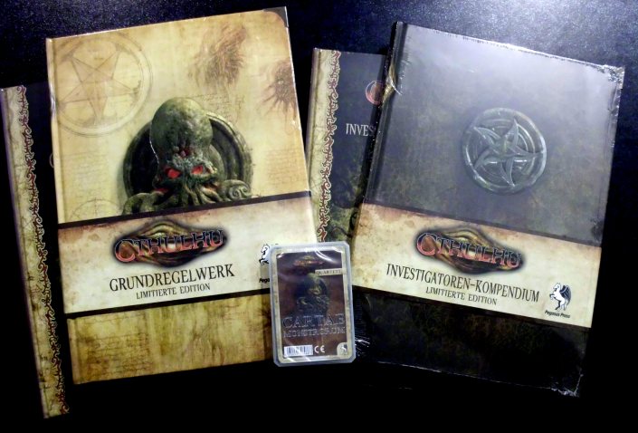 Es ist nicht tot, was ewig zu liegen vermag,und in fremden Zeitaltern mag selbst der Tod sterben. Ich bin gerade aus R’lyeh zurück und habe Euch die neue Auflage des Cthulhu Rollenspiels mitgebracht, wir haben das Grundregelwerk und die Investigatoren Handbücher sowohl in der limitierten und der normalen Version vorrätig. Interessant ist auch die Komplettausgabe, bestehend aus Grundregelwerk und vier Investigatoren Kompendien und dem Spielleiterschirm zum Sonderpreis. Also ladet eure Revolver, packt das Necronomicon ein und hofft, dass Ihr nicht Wahnsinnig werdet. FHTAGN!