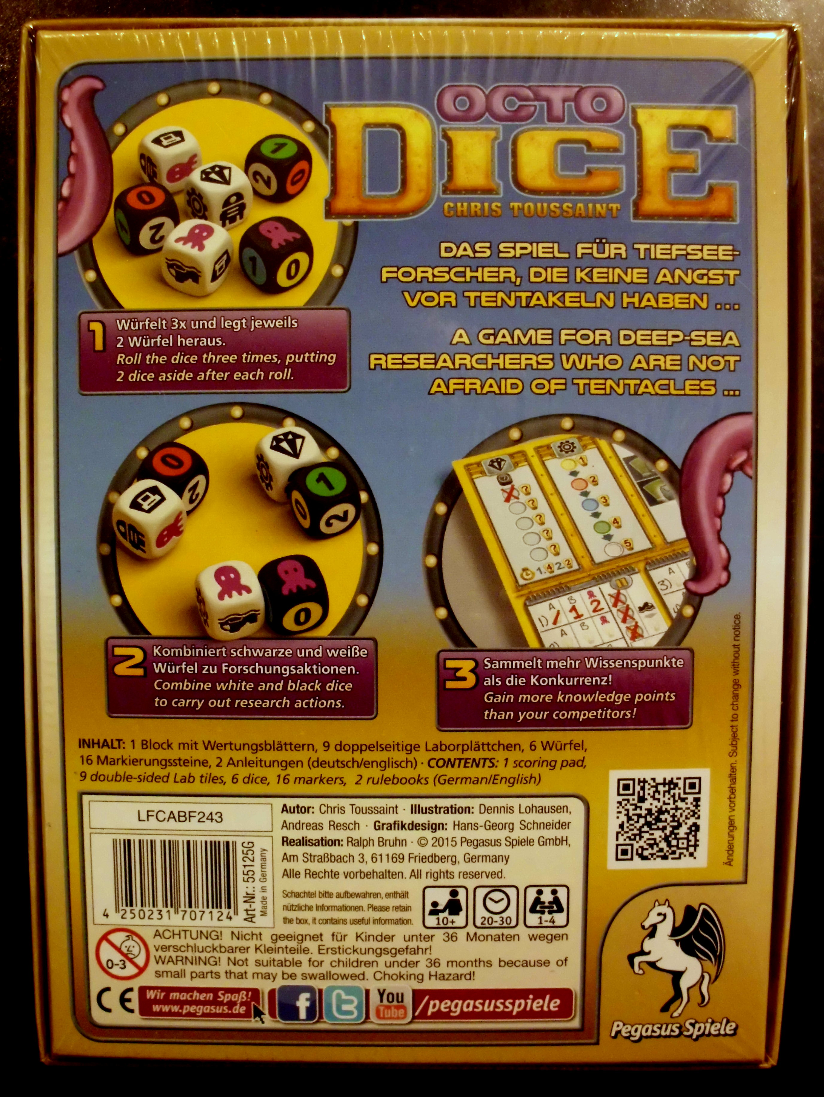 Tentakel wo man hinschaut, bei Octodice von Pegasus versuchen wir mit Würfeln unsere Unterwasserstation auszubauen und möglichst viele Punkte zu machen, doch vorsicht vor den fiesen Octopoden mit ihren schleimigen Tentakeln. Octodice ist ein lockeres Würfelspiel mit hohem Spassfaktor und bestens für Familien und Gelegenheitsspieler geeignet.