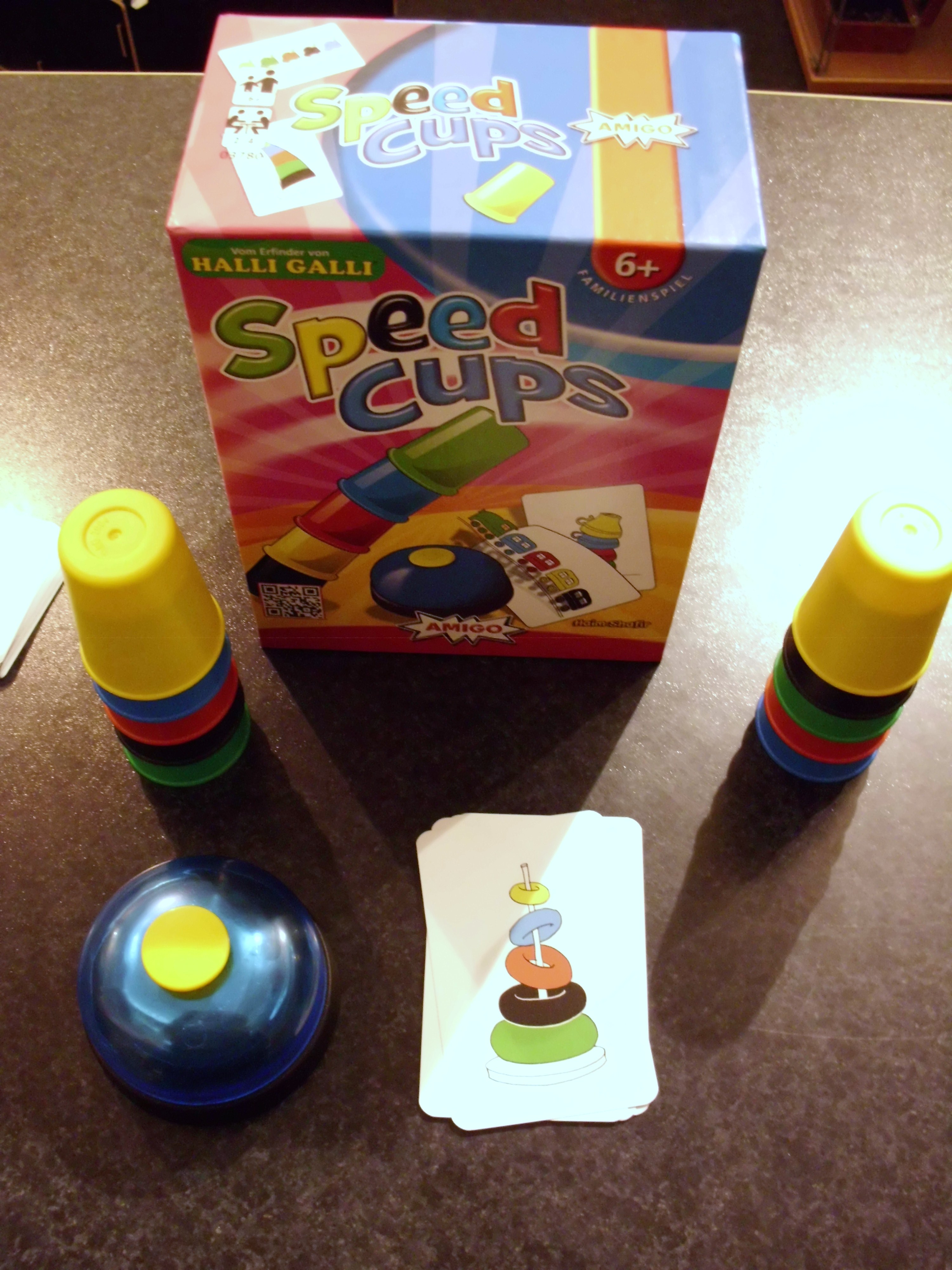 Bei Speed Cups bekommt jeder Spieler fünf Cups in fünf unterschiedlichen Farben. Ziel des Spiels ist es dann diese Cups anhand einer aufgedeckten Karte möglichst schnell in die richtige Farbfolge übereinander zu stapeln. Wer denkt das er dies richtig gemacht hat, haut so schnell wie möglich auf die Glocke. Wer dann alles richtig sortiert hat, hat die Runde gewonnen und es kann die nächste Runde gespielt werden.