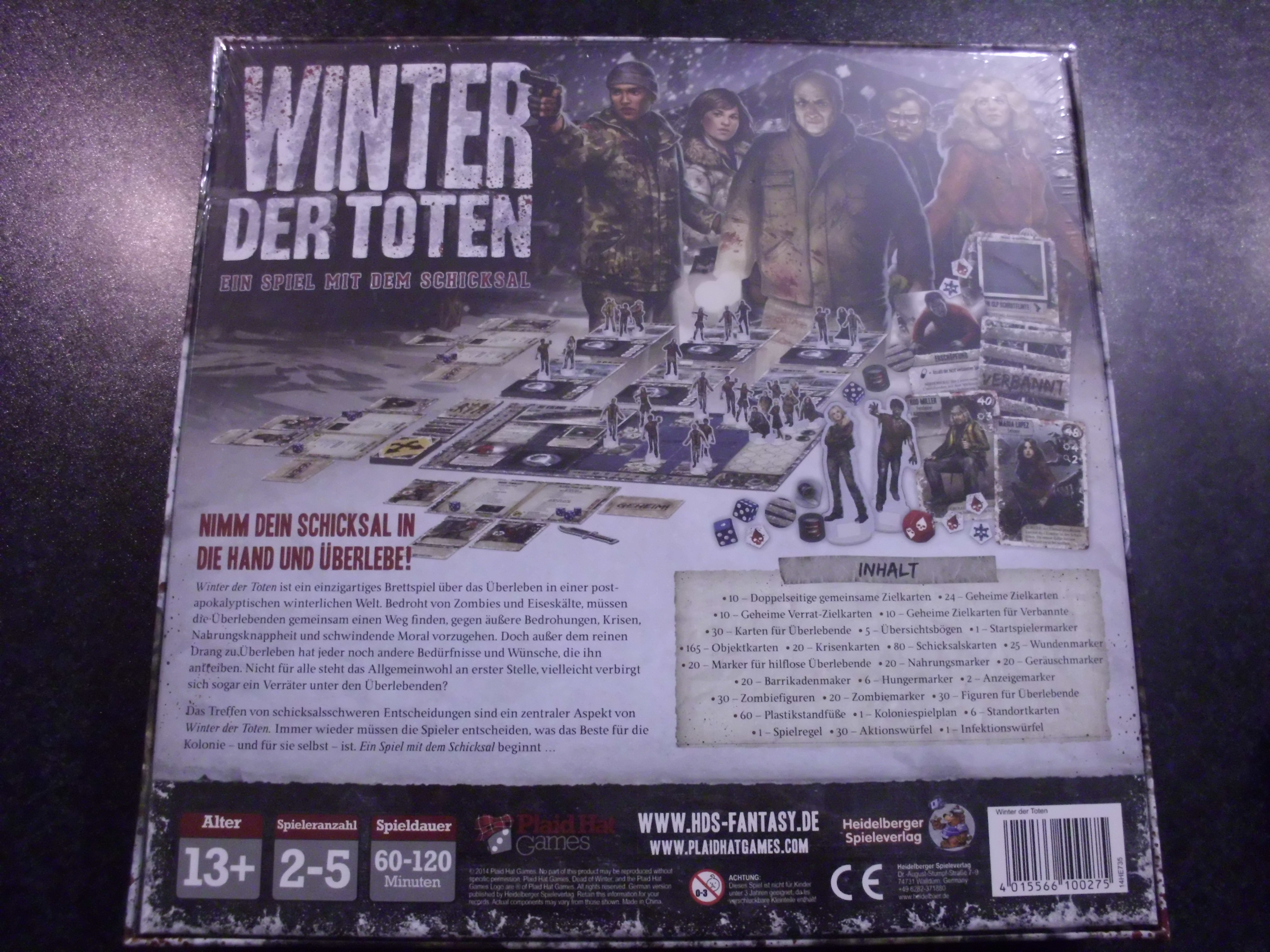 Bei dem Semi-kooperativen Spiel Winter der Toten seid Ihr Teil einer Gruppe Überlebender der Zombie Apokalypse, die Rationen sind knapp und Untote lauern überall, das schlimmste ist aber, ihr könnt nicht jedem vertrauen denn jeder verfolgt auch seine eigenen Ziele! Also wetzt die Machete und ladet die Schrotflinte durch!